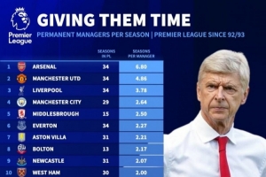 英超各队历任主帅平均执教时长:阿森纳、曼联、利物浦、曼城前四