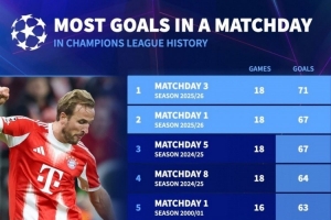 欧冠单轮进球数量榜:本轮18场比赛71球居首,本赛季首轮67球次席