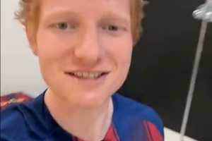 体育资讯10月26日讯 今晚西甲迎来国家德比,英国著名歌手艾德-希兰穿巴萨球衣助威。